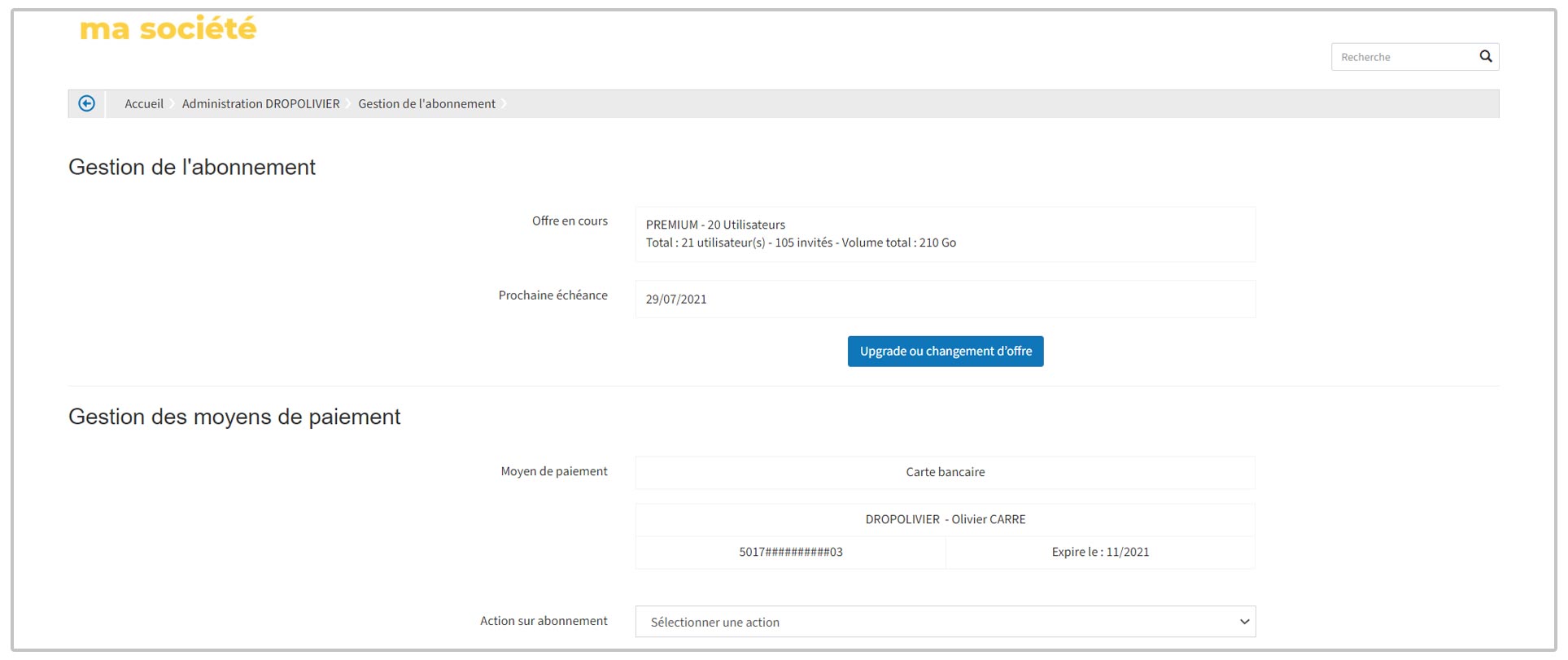 Il est également possible de consulter le moyen de paiement utilisé et de changer le type de paiement (par prélèvement SEPA ou par CB) à l’aide du menu déroulant « Action sur abonnement ». L’administrateur peut également suspendre son abonnement de cette façon.